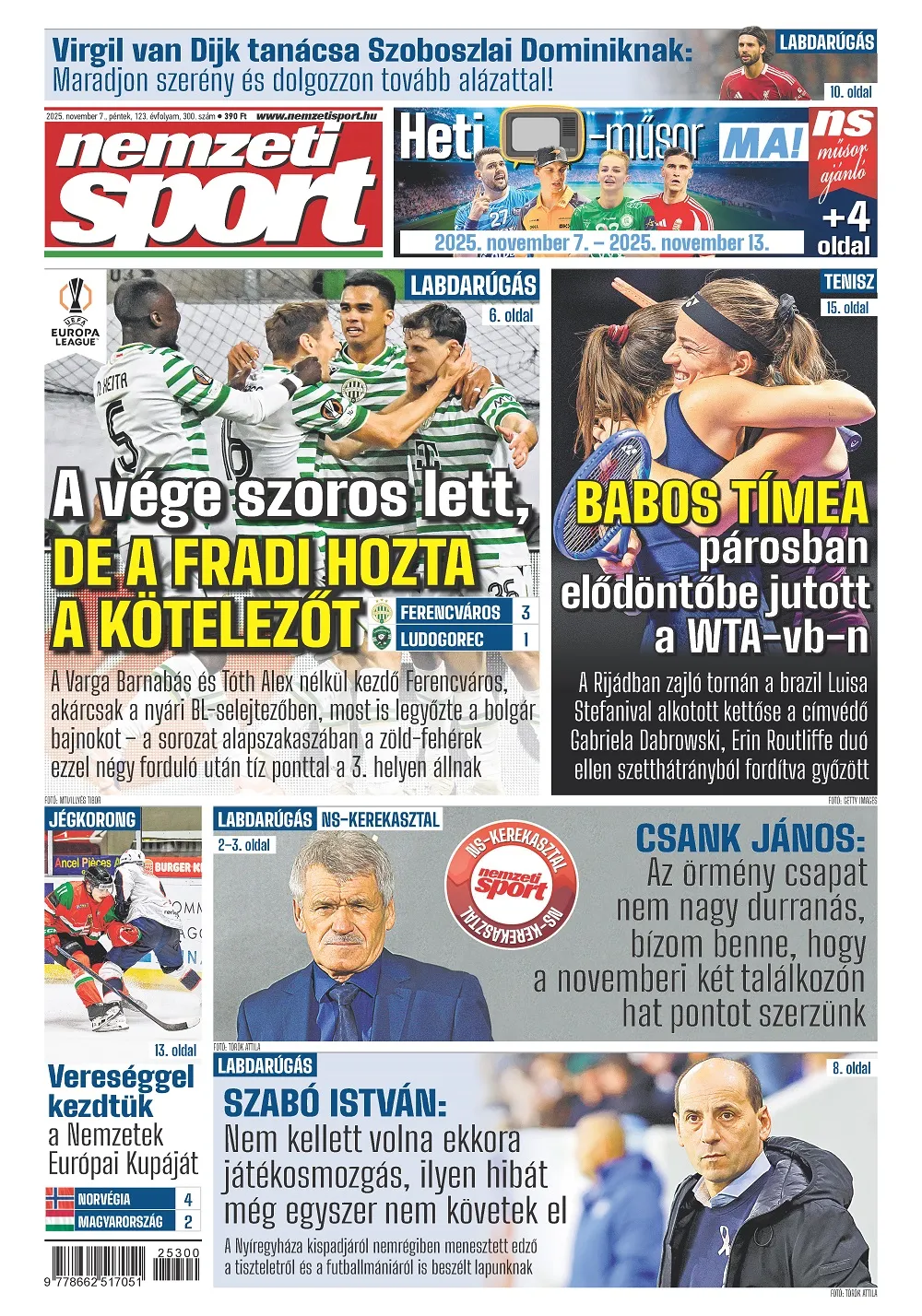 Öltözői szigor? A futballpályán nincs demokrácia! Az NS-kerekasztal című, havi rendszerességgel megjelenő rovatunkban ezúttal október legizgalmasabb témáit boncolgatjuk. A válogatott alaposan kitett magáért a világbajnoki selejtezősorozatban, Örményországot 2–0-ra győzte le, míg Portugáliában 2–2-es bravúrt ért el. Az NB I-ben eközben megtörtént a második edzőváltás is, Nyíregyházán Szabó István munkáját köszönték meg. A 245. derbi pedig nem a játékról marad emlékezetes, hanem Gróf Dávid különös megmozdulásáról, aki csúnyán ellökte a labdaszedőt. A három témában Csank János korábbi szövetségi kapitány, Pásztor József, a Békéscsaba szakmai igazgatója, korábbi 9-szeres válogatott középpályás, valamint Hajdú B. István, az M4 Sport kommentátora mondta el a véleményét Borbola Bencének