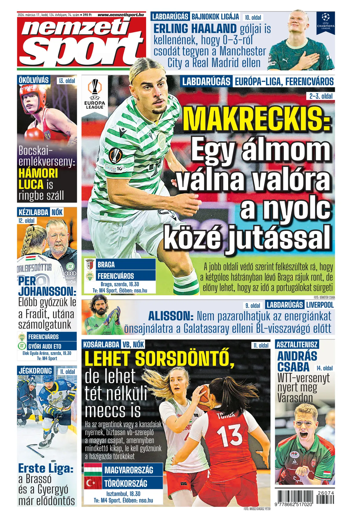 A nyáron lesz három éve, hogy szabadon igazolható futballistaként érkezett a bolgár Pirintől az Üllői útra Cebrail Makreckis. A Ferencváros 25 esztendős lett játékosa a Braga elleni Európa-liga-nyolcaddöntő első, budapesti mérkőzésén a második FTC-gólt készítette elő, s Lenny Joseph zárta le góllal az akciót. Címlapsztorinkban arról is beszélt, hogy „önbizalommal várom a visszavágót, talán mondhatom ezt a csapattársaim nevében is. A párharc előtt mindenki azt mondta, a Braga az egyértelmű favorit, ha nem is könnyedén, de ő jut a negyeddöntőbe. Az első meccsen azonban bebizonyítottuk, igenis számolni kell velünk. Nem azt mondom, hogy innen már egyenes út vezet a nyolc közé, de az biztos, hogy óriási harcra kényszerítjük a Bragát.”