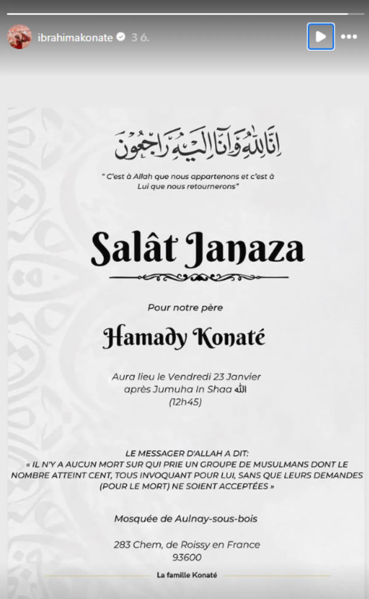 Konaté az Instagram-oldalán megjelent poszttal jelezte, hogy édesapja, Hamady Konaté elhunyt.
