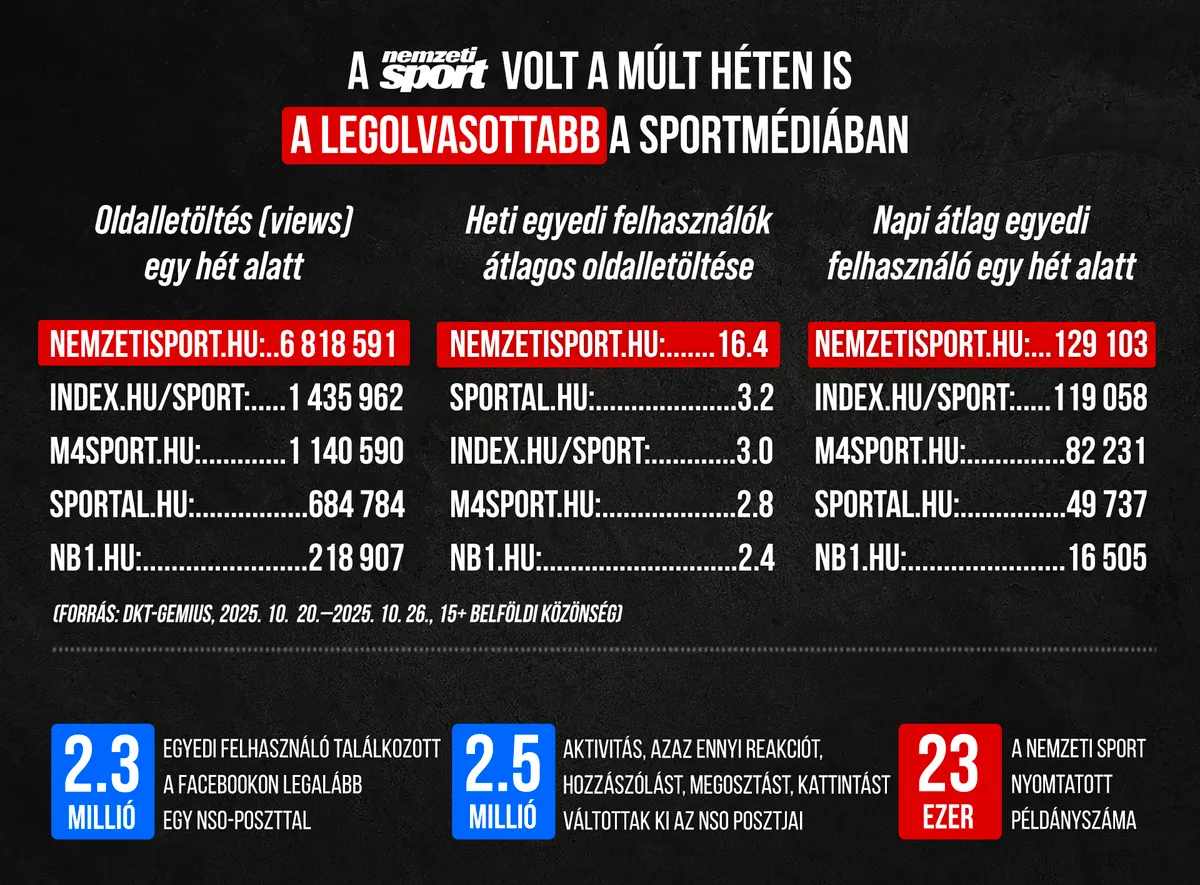 A 2025-ös év 43. naptári hetében is a Nemzeti Sport Online volt a magyar sportrajongók legolvasottabb honlapja. Az október 20-tól október 26-ig tartó időszakban több mint 6.8 millió oldalt töltöttek le felhasználóink. A Nemzeti Sport a közösségi médiában is népszerű, több mint 2.3 millió felhasználó találkozott posztjainkkal, és természetesen a nyomtatott lapok piacán is a Nemzeti Sport a legolvasottabb sporttartalom, immár 122 éve (a múlt hónap átlagos napi nyomtatott példányszáma 23 137).