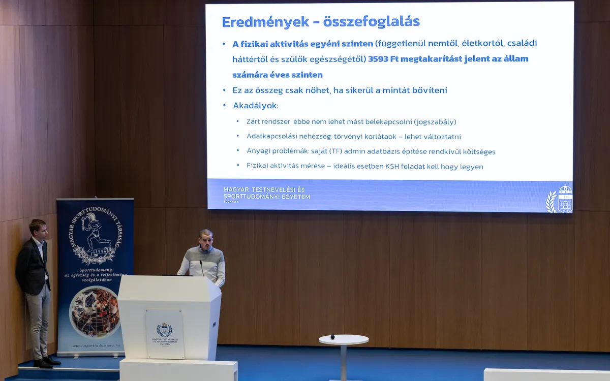 Szó esett a magyar sportközegben jellemző (nyári) olimpiacentrikus gondolkodásról, a mesterséges intelligencia nemzetközi sportfejlesztéseket uraló témájáról és a mindennapos testnevelésről mint az oktatási rendszer erényéről is. Csurilla Gergely, Kendelényi-Gulyás Erika, Koch Ágoson és Sterbenz Tamás közös kutatási eredményei arra mutattak rá, hogy a fizikai aktivitás hatása miként jelentkezik az egészségügyi kiadásokban. Tanulságos példa: a vizsgált adatok szerint a – jellemzően az idősebbeknél kisebb orvosi-kórházi figyelmet igénylő – fiatal felnőttek körében is évente 3593 forint a pénzben kimutatható megtakarítás, ha az illető rendszeresen végez testmozgást. Géczi Gábor tanszékvezető egyetemi tanár négy kollégájával (Dolnegó Bálint, Széles József, Koch Ágoston, Géczi Gergely) végzett kutatása a nemzetközi eredményesség változását tekintette át a taotámogatásban részesülő sportágaknál 2010-től, és – a pénzügyi segítség mértékét, a sportolók számát és az eredményességet rögzítő grafikonok alapján – többek között arra a megállapításra jutott, hogy a tao-s sportok finanszírozási lehetőségei nem okoztak nagyobb mértékű javulást a nemzetközi sikerességben. A kutatás következtetésként az évi mintegy 125 milliárd forintnyi taotámogatás felülvizsgálatát szorgalmazza, nem feltétlenül mértékének a növelését, inkább hatékonyabb elosztását indítványozva. Az eredményesség javításához a többi folyamatformáló tényezőben is pozitív változást tartana kívánatosnak, ideértve a toborzás, a tehetséggondozás, az edzőképzés és a bajnoki rendszerekben érvényesítendő versenyegyensúly kérdését. Ami a sportolók körét illeti, a vizsgálat arra jutott, hogy a versenyzői létszámadatok egybevágnak a népességváltozás mutatóival.