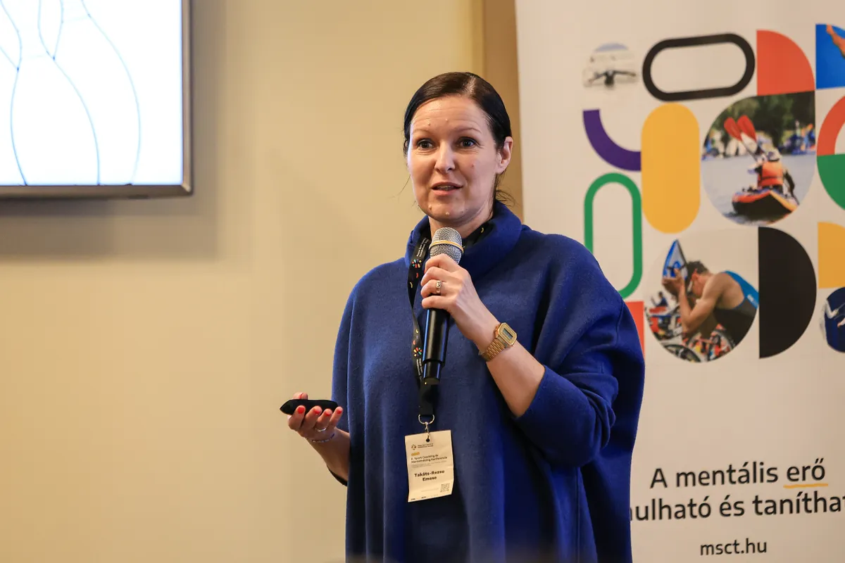Takáts-Rezsu Emese sport coach, mentál- és csapatépítő tréner a megfelelési kényszerről és a mentális egészségről adott elő a fiatal sportolók vonatkozásában.