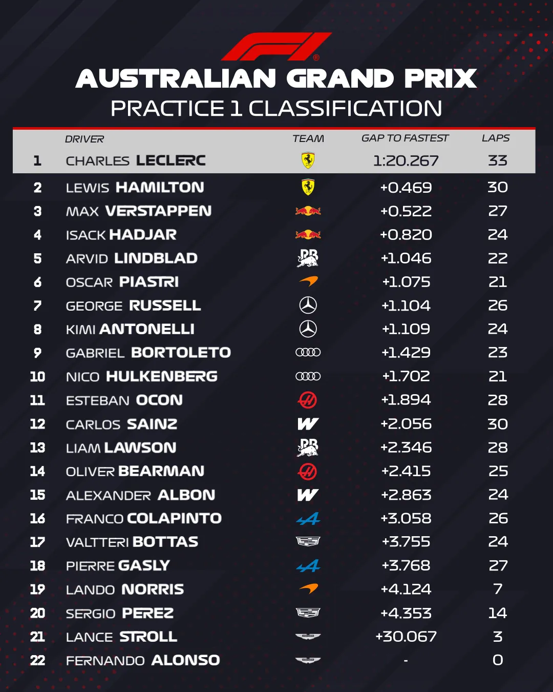 Nem indult jól a 2026-os szezon egyetlen újonca számára sem a nyitó edzés: Arvid Lindblad alatt a bokszutca végén állt meg a Racing Bulls, aminek következtében először sárga zászlós, majd virtuális biztonsági autós jelzést léptettek érvénybe. A brit a problémás rajt után viszont vissza tudott térni, és összesen 22 kört tett meg, miközben az ötödik helyével a nyitány egyik pozitív meglepetését szolgáltatta.