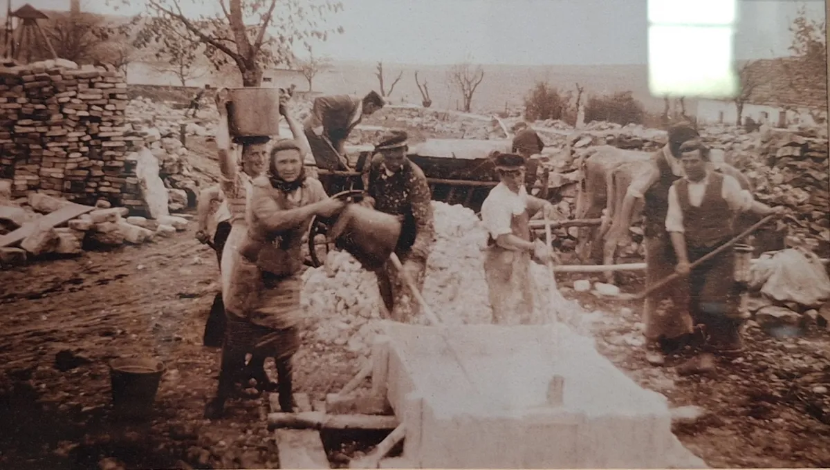A falakon a kalákában szervezett templomépítést rögzítő fényképek láthatók, talicskázó férfiak hordják a köveket, fejkendős asszonyok öntik vödörből a vizet, falubeli fiatalok rakják a téglát. Az igazán meghökkentő elem a felvételek mellett szereplő dátum: 1949–1950. Nem éppen a templomépítések slágerkora... Márton Antal korabeli plébános vezetésével és a környékbeliek összefogásával a történelem ellenszelében is sikerült templomfalakat emelni a – szentmisét addig kényszerűségből az iskola tantermében hallgató – hívek köré, lökést adva a két szomszédos település, Hárságypuszta és Gyertyánkút közösségi életének (a községek hat évvel a templomszentelés után, 1956 nyarán egyesültek Hárskút néven).