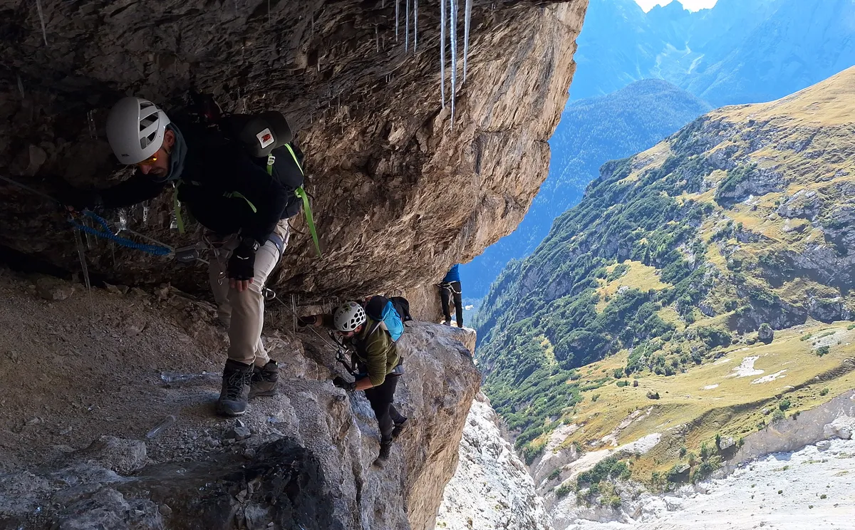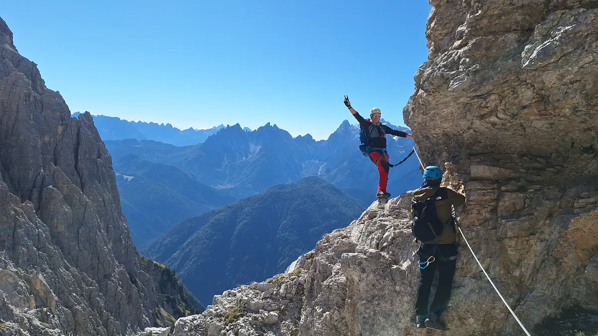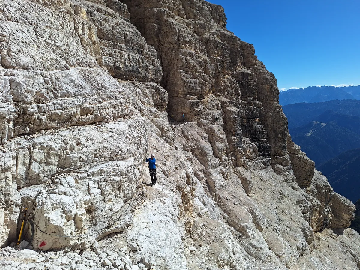 És ha már visszarepültünk a jelenbe, említsünk meg még egy különleges kapcsot: a Zsigmondy Asztal tagjainak egyik első túrája éppen a 2025-ös utazásunk helyszínéül szolgáló Sexteni-Dolomitok vidékére vezetett, oda, ahol ma már egyes szakaszokon kiépített vasalt kötélpálya, vagyis via ferrata segíti a haladást a sziklaoldalakon, szakadékok fölött, szűk hasadékokon, szabálytalan párkányokon, meredélyeken. Nem kezdőknek való terep, erős összpontosítást igényel; beszédes a csend, amely egy-egy intenzívebb szakaszon a monoton dolgozó társaságra telepszik a ki-beakasztgatott karabínerek kemény kattogása közepette. Az ember pedig óhatatlanul belegondol, hogy milyen elképesztő körülmények, rendkívüli viszontagságok között zajlottak a lehetetlenül sziklás terepen az első világháború küzdelmei az Osztrák–Magyar Monarchia és Olaszország hegyi csapatai között. A több mint száz évvel ezelőtti ádáz harcoknak ma is jó néhány helyen mutatkozik nyoma, egy-egy sziklába vájt bunker, kövekből összehordott lőállás, ottmaradt szögesdrótdarab árulkodik a történelem viharairól. A XX. század forgószele söpörte el később a Zsigmondy Asztalt is, amelynek sorsáról Bucsek Henrik ezt jegyezte fel a Töredék a magyar hegymászás történetéből című 1973-as könyvében: „A társaságot a II. világháború után a Magyar Turista Egyesülettel együtt oszlatták fel. Tagjainak többsége ma már nem él. De a néhány megmaradottban töretlenül él a hegyek szeretete, él a régi lelkesedés.”