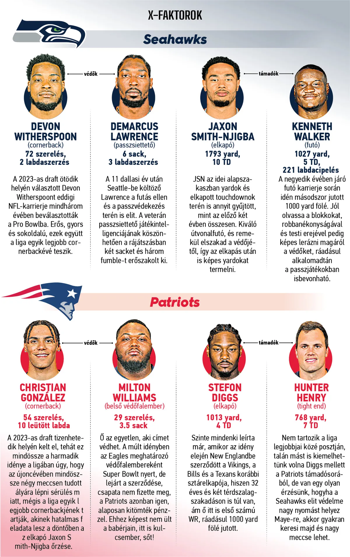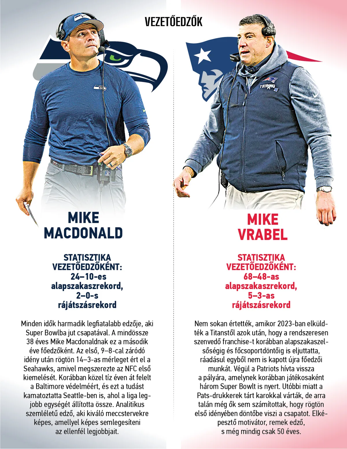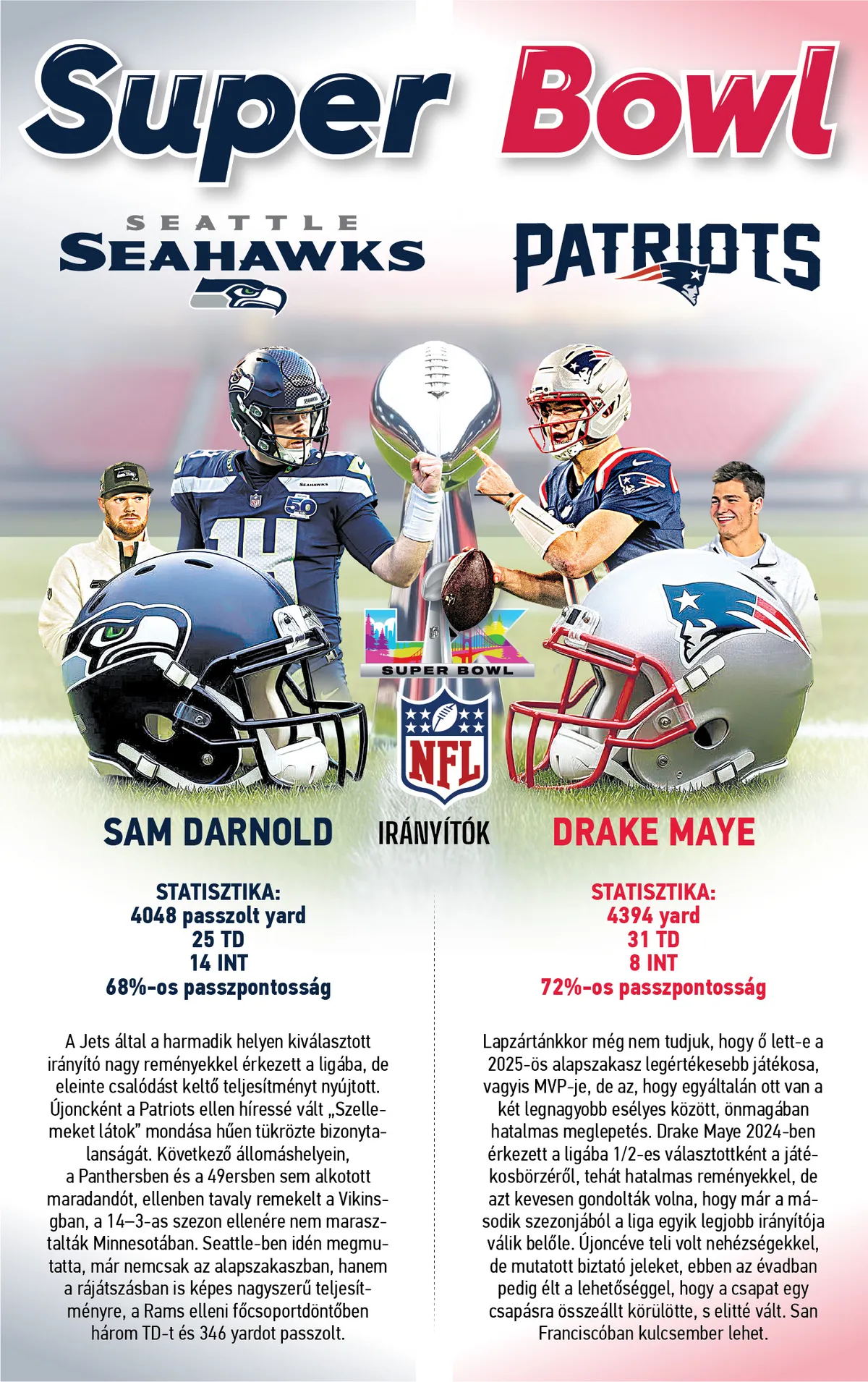 Magyar idő szerint hétfőre virradóra rendezik meg a tengerentúli profi amerikaifutball-liga nagydöntőjét, a 60. Super Bowlt. Ez az évad teli volt meglepetéssel, végül a fináléba is két olyan csapat jutott el, amelynek győzelmére kevesen fogadtak volna az idényt megelőzően. A Seattle Seahawks másodjára, a New England Patriots hetedjére ülne fel a trónra, de mindkét franchise egy újrahúzott garnitúrával. Ami még pikánsabbá teszi a döntőt, az az, hogy előbbi revansot venne a tizenegy évvel ezelőtti Super Bowl-vereségért...