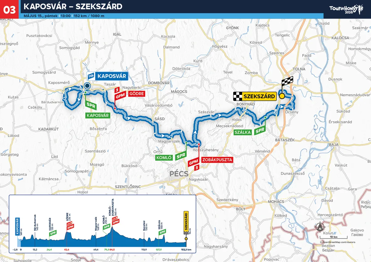 Harmadnap Kaposvárról indul a mezőny, Somogy vármegye székhelyéről korábban Giro d’ Italia-szakasz is kezdődött. A zselici tájak után a boráról ismert Szekszárdon ér véget az etap, a város a magyar kerékpársportban is jelentős hagyományokkal bír a Gemenc-nagydíj és a helyi egyesület miatt is, ahol számos sikeres bringás nevelkedett.
