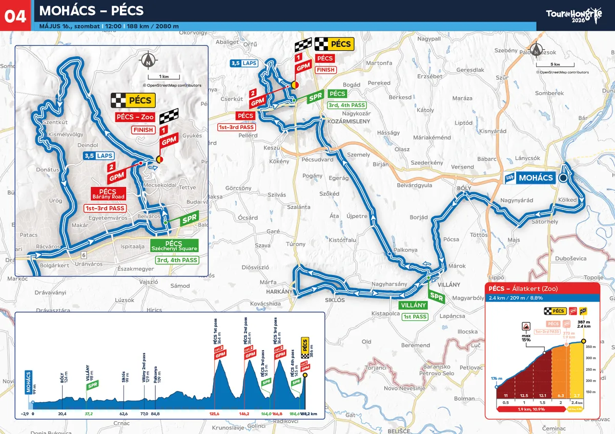 A mohácsi csata ötszázadik évfordulója miatt a várost nem lehetett kihagyni az útvonalból, onnan indul a királyszakasz. A több mint kétezer méteres szintkülönbségű etap során a Villányi-hegységet érintve érkeznek meg Pécsre a bringások, akik négyszer tekernek fel a meredek Bárány úton az állatkerthez.