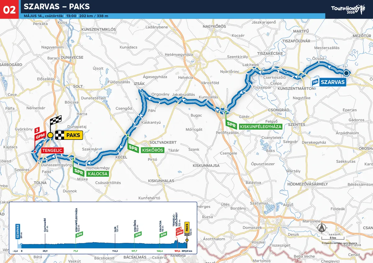 Másnap Szarvason, a víziszínpad mellől rajtolnak a kerékpárosok és a dél-alföldi tekerés után Kalocsánál kelnek át a Dunán. A leghosszabb, 202 kilométeres etap végén némi emelkedő nehezítheti a versenyzők helyzetét a paksi befutó előtt, de itt is a sprinterek közül kerülhet ki a győztes.