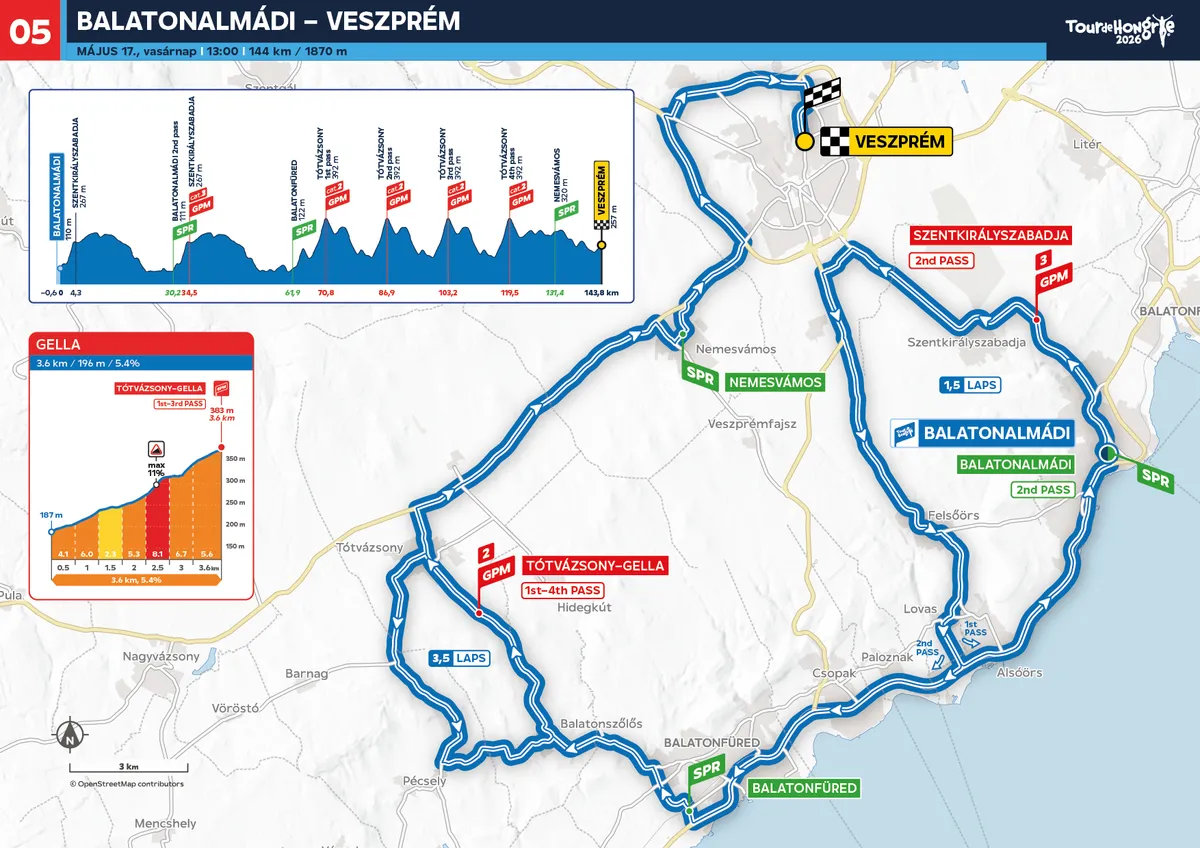 A zárónap sem lesz könnyű, Balatonalmádiból indulva a Balaton-felvidék hangulatos útjain át érik majd el a versenyzők Veszprémet. Gella és Szentkirályszabadja emelkedőjének köszönhetően ezen a rövid, 144 kilométeres távon is mintegy 1800 méteres szintkülönbséget kell leküzdeni Európa idei sportrégiójában.