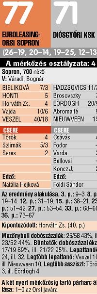 Két perccel a vége előtt Eördögh az alapvonalon kívülre zuhant, és a soproniak négy diósgyőri ellen támadhattak, de sportszerűen megálltak, hogy az ellenfél legjobbját ápolhassák. A lelátó népe közben szinte egyemberként buzdította a soproniakat, ám időnként disszonáns hangoknak is fültanúi lehettünk, amik miatt Földi Sándor, a DKSK edzője fel akart rohanni a nézőtérre, de ebben szerencsére megakadályozták… Az utolsó pillanatokban az addig igen halvány teljesítményt nyújtó Horváth két szemfüles találatával tartotta meg hatpontos előnyét a házigazda.
