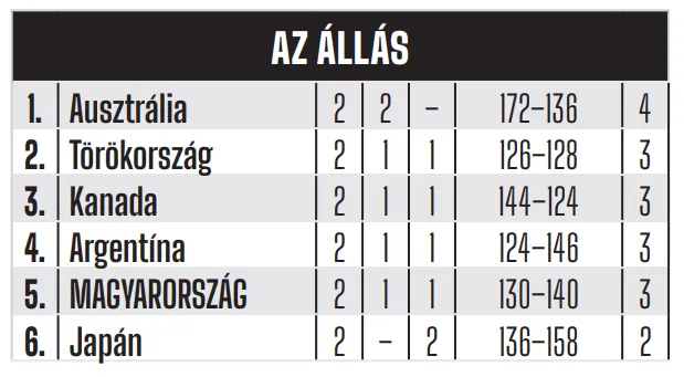 A legutóbbi vb-n negyedik helyezett rivális a második félidőt 39–23-ra nyerte meg, de a meccs már a harmadik negyedben eldőlt, amikor 15 pont fölé nőtt a két csapat közötti különbség. Szombaton a csoport favoritjával, Ausztráliával játszunk, de a kulcsmeccs az argentinok elleni vasárnapi összecsapás lehet.