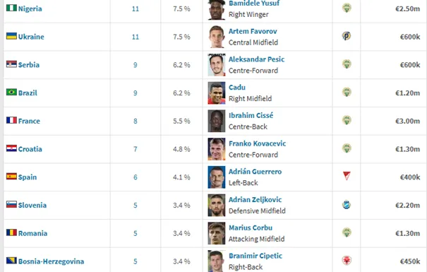 | 4. Rafiu Durosinmi (nigériai, 23 éves, 52.) | Viktoria Plzen (Csehország) – Pisa (Olaszország) | 7.5 millió |