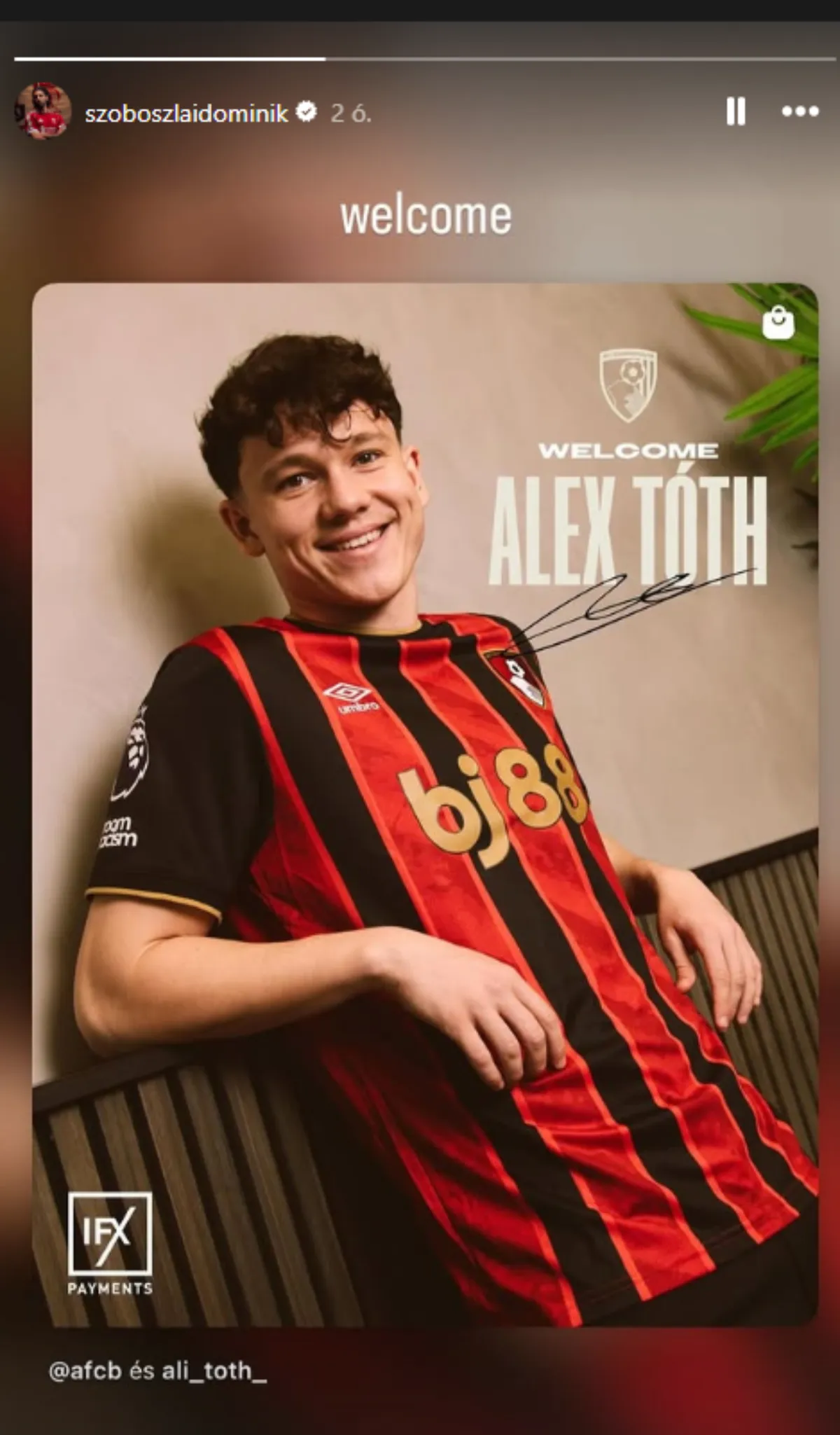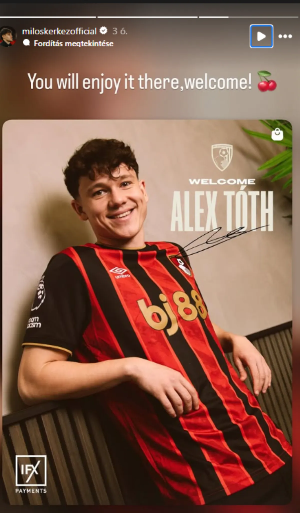 Szoboszlai Dominik, a Liverpool FC középpályása és Kerkez Milos, a klub védője az Instagram-oldalán megjelent rövid üzenetben üdvözölte Tóth Alexet, az AFC Bournemouth új játékosát a Premier League-ben.