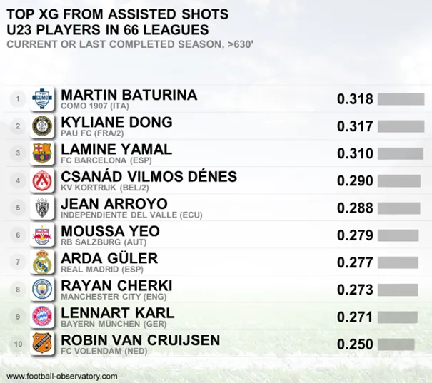 A CIES egy olyan statisztikát tett közzé, amely 66 bajnokság U23-as játékosait rangsorolja a passzaikból kialakuló helyzetek minősége, azok várható gólmutatója alapján.