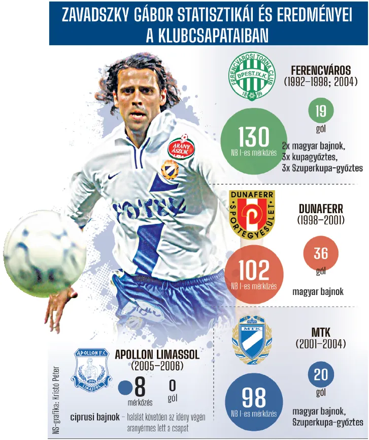 Két évtizede – aki emlékszik rá, aligha felejti el a napot: 2006. január 6-án Cipruson életét vesztette Zavadszky Gábor négyszeres válogatott futballista. A Ferencvárosban lett ismert, tagja volt a zöld-fehérek bajnokcsapatának 1995-ben és 1996-ban, a klub történetének első Bajnokok Ligája-gólja előtt ő adta a passzt Lisztes Krisztiánnak (Zürichben Vincze Ottó további két góljával 3–0-ra győzött a csapat a Grasshoppers ellen), 1993-ban, 1994-ben és 1995-ben Magyar Kupát nyert. Aztán 1998-ban Dunaújvárosba szerződött, ahol 2000-ben ünnepelhetett bajnoki címet, 2001-ben lett az MTK Budapest játékosa, amellyel 2003-ban – az utolsó pillanatban éppen a Ferencvárost megelőzve – harmadik klubjával negyedszer lett aranyérmes. Majd 2004 őszén visszatért a Fradihoz, 2005 elején igazolt Ciprusra, és egy évig, haláláig a limassoli Apollon játékosa volt.