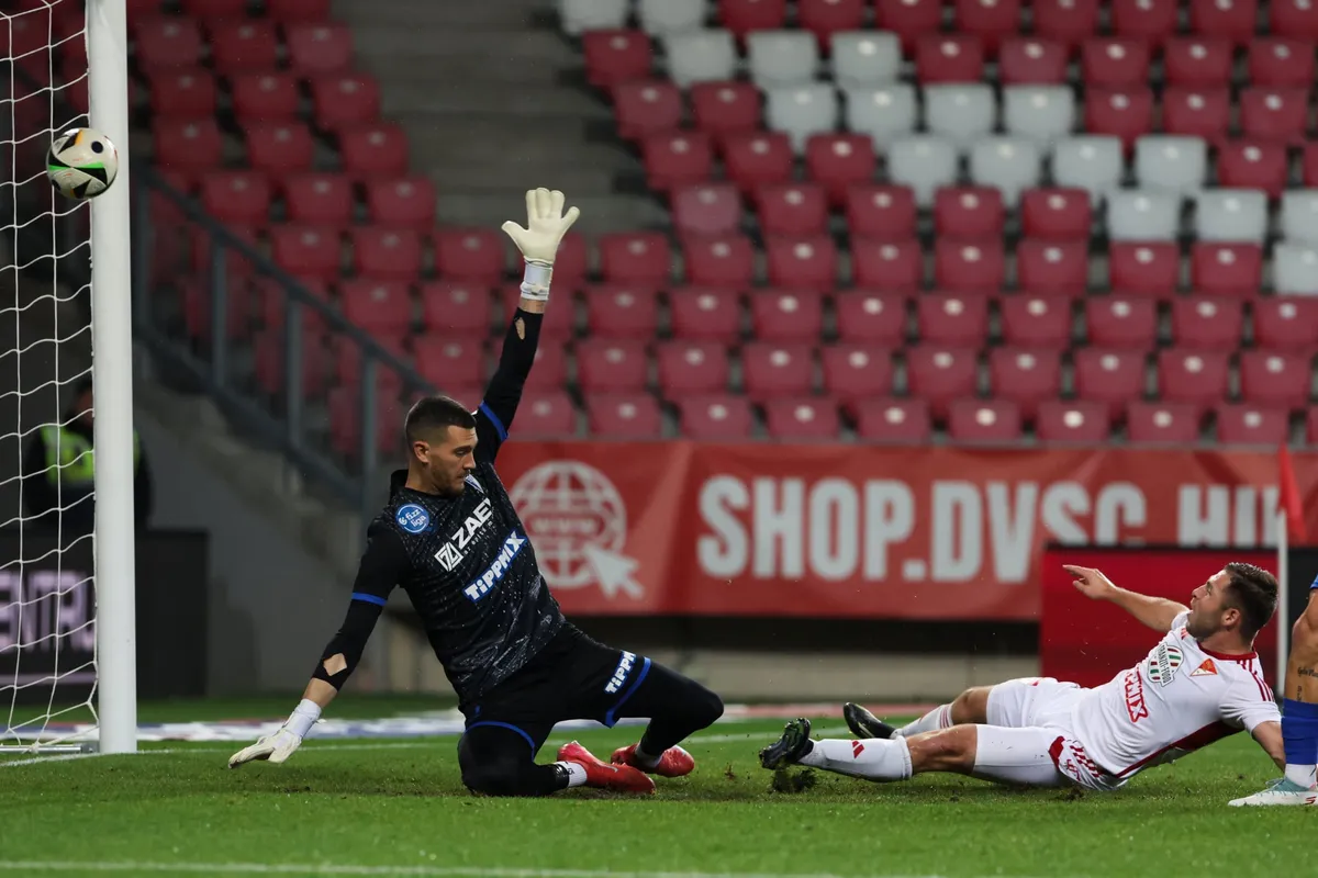 LÉC! Skribek jobbról jobbal középre emeli a labdát, Klausz meg hatról fejjel nem sokkal téveszti el a bal felső sarkot!