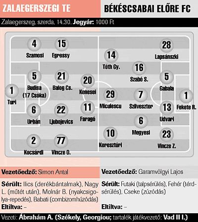 A Békéscsaba 6–1-re kapott ki szombaton a DVSC-től, és most két nehéz meccs vár a gárdára Nyugat-Magyarországon. Amúgy ezért is cserélték fel a pályaválasztói jogot a zalaiakkal, hiszen a 2. fordulóból az egerszegiek nemzetközi kupaszereplése miatt elhalasztott, ZTE elleni találkozó után Győrött játszik a csapat, és a csabaiak a hét végi bajnokiig nem is utaznak haza. A debreceni mérkőzésen Cseke László rúgást kapott a vádlijára, és rá aligha számíthat Garamvölgyi Lajos vezetőedző.