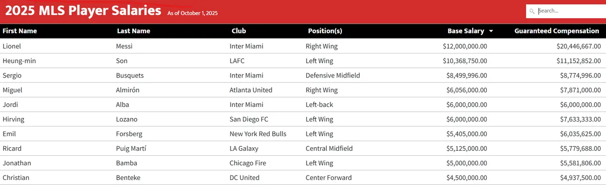 A rangsor élén nem meglepő módon Lionel Messi áll, aki alapfizetésként 12 millió dollárt (4 milliárd 12 millió forintot) kap, összesen pedig 20 446 667 dollárt (6 837 344 998 forint) keres egy esztendőben. Az argentin zsenit a Los Angeles FC-ben szereplő dél-koreai Szon Hung Min követi, neki összességében 11 152 852 dollár (3 729 502 555 forint) az éves járandósága. A dobogó legalsó fokán Messi volt és jelenlegi csapattársa, Sergio Busquets áll, neki összesítve 8 774 996 dollár (2 934 349 887 forint) szerepel a bérjegyzékében.