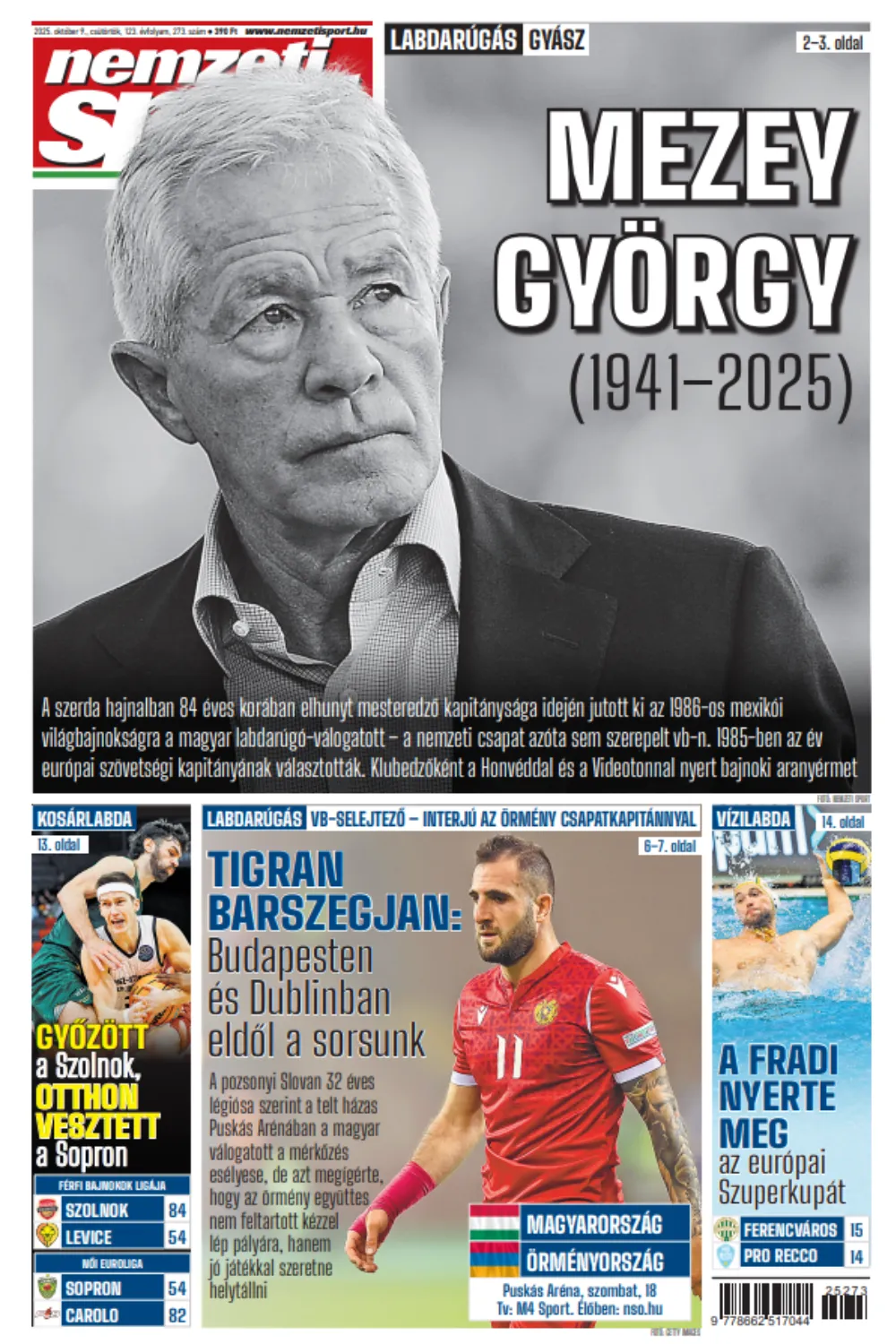 A pozsonyi Slovan örmény játékosa a szombati vb-selejtezőről; Mezey Györgyre emlékezünk
