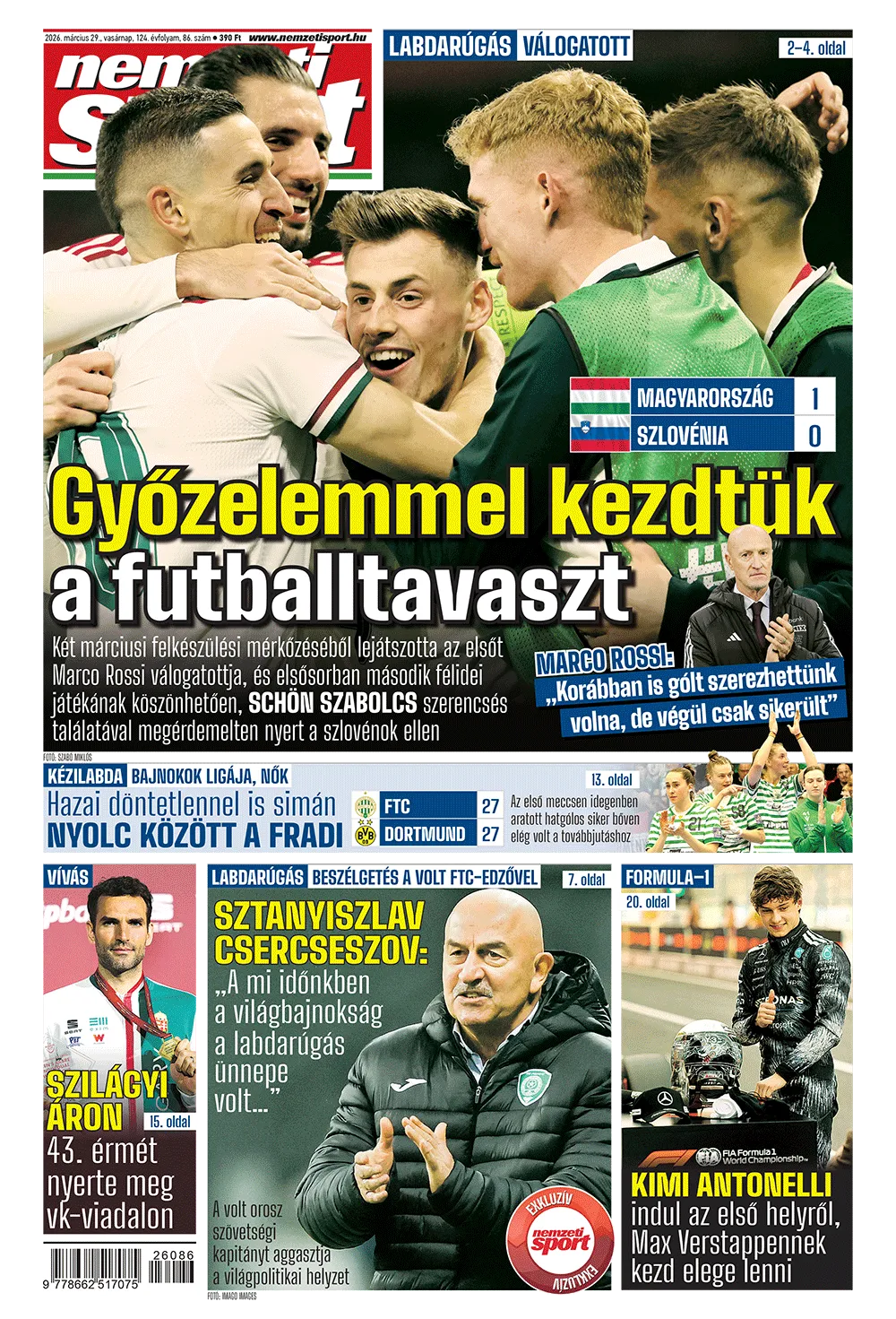 Schön Szabolcs gólja döntött: nyertünk! A második félidőben mutatott játék alapján abszolút megérdemelt győzelmet aratott a labdarúgó-válogatott Szlovénia ellen – Marco Rossi külön kitért Tóth Balázsra, Vitális Milánra, Bárány Donátra és Schönre, arra, hogy mit súgott a lecserélt Szoboszlai Dominik fülébe, no meg arra is, hogy Arne Slot kedvében járva sem Szoboszlai, se, Kerkez Milos nem töltötte az egész meccset a pályán. Címlapsztori három oldalon.