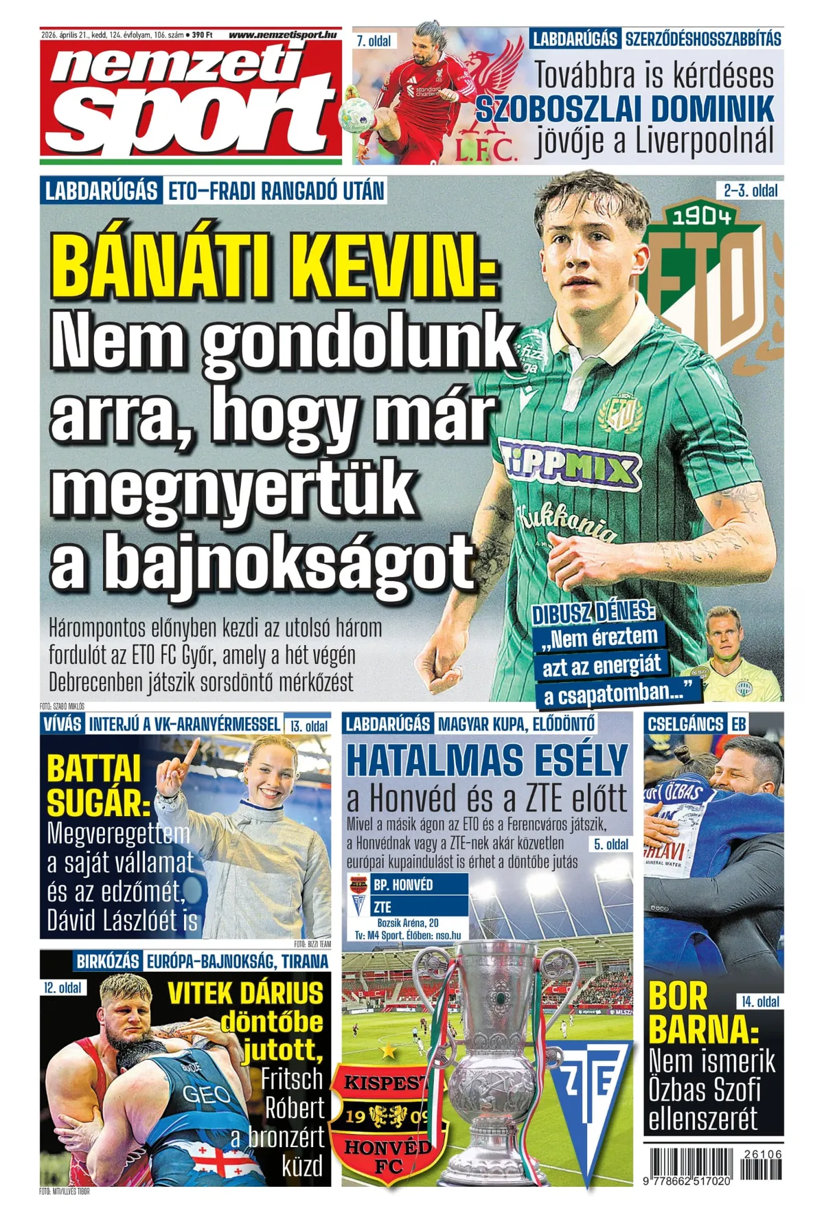 Nem csitulnak a vasárnapi ETO–FTC hullámai. A tavasz bajnoki szuperrangadója után a győriek kerültek hárompontos előnybe, ám a győztes gólt szerző Bánáti Kevin figyelmeztet: még nem nyerték meg a bajnoki aranyat. Dibusz Dénes ugyanakkor nem akarja a játékvezetőre hárítani a győri gólt, ellenben rendkívül kritikus hangot ütött meg saját csapatának produkcióját illetően. Címlapsztori két oldalon.