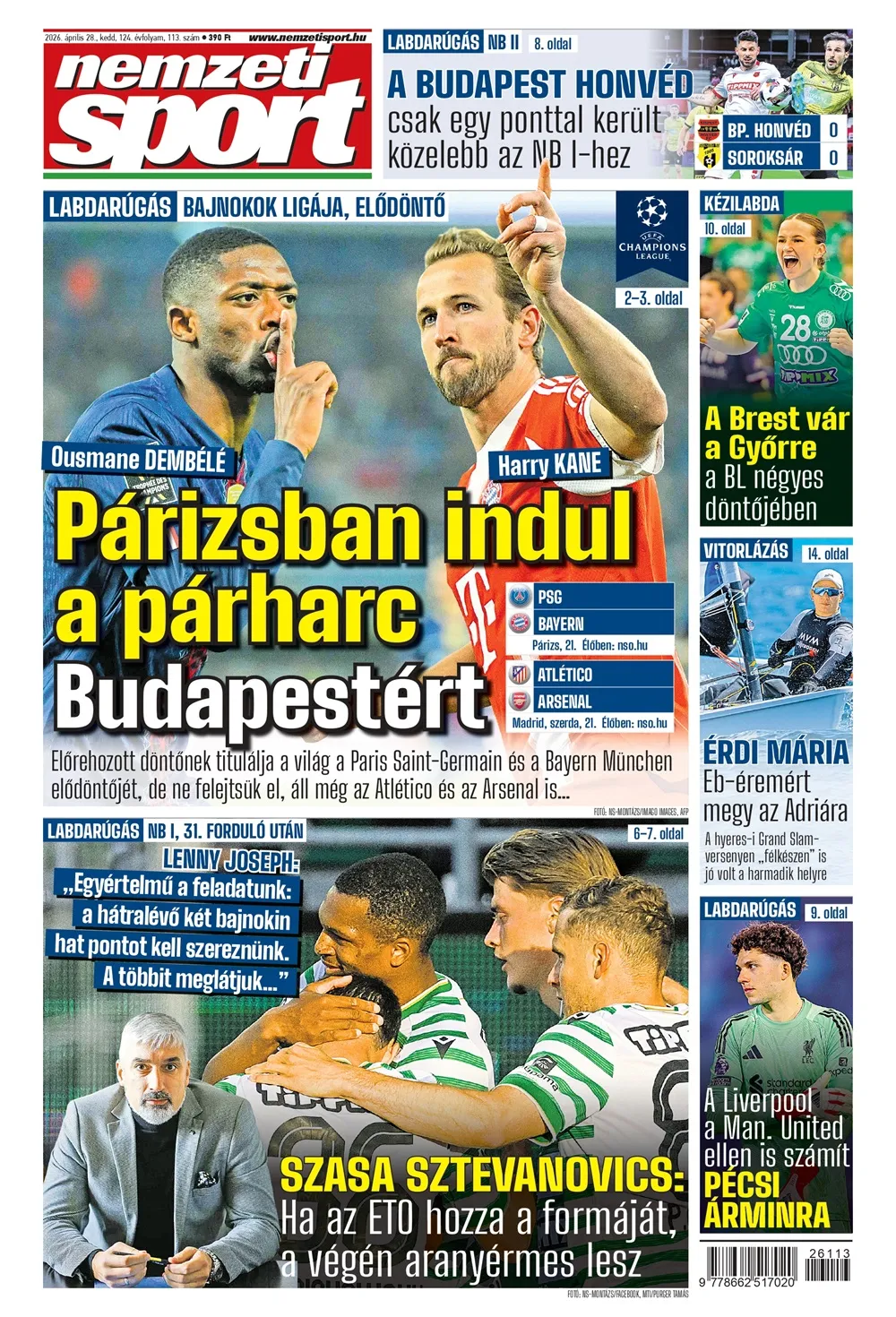 Kezdődik az utolsó előtti felvonás a labdarúgó Bajnokok Ligájában. Nincs vita, hogy a keddi Paris Saint-Germain–Bayern München meccs az ínyenceknek való futballcsemege lesz, de ez nem jelenti azt, hogy a végső győztes nem az Atlético és az Arsenal párharcából érkezik majd május 30-án a Puskás Arénába… Címlapsztori két oldalon.