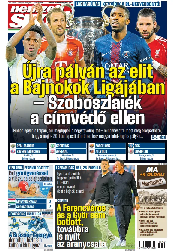 Újra pályán az európai elit a Bajnokok Ligájában. Madridban Real–Bayern csúcsrangadóval indult a heti programban, ember legyen a talpán, aki helyesen tippel a továbbjutóra, de a két magyarral fellépő Liverpool szerdai párizsi meccse sem nélkülözi az izgalmakat. De vajon biztos-e a Barcelona–Arsenal elődöntő? Címlapsztori két oldalon.