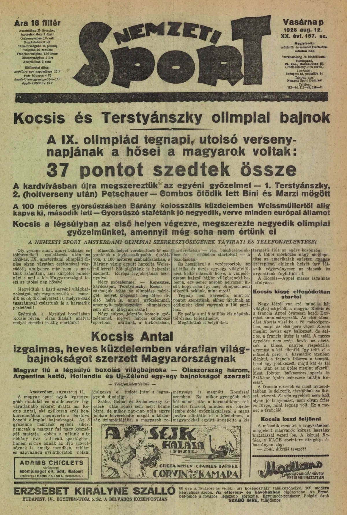 Újabb európai, a kőkemény milánói olasz, Carlo Cavagnoli volt a harmadik ellenfél. Itt sem volt vita, ezzel a dobogó már garantálva volt, és a francia Armand Apell ellen már az olimpiai aranyérem és vele az örökkévalóság volt a tét. Innentől adjuk át a szót a Nemzeti Sportot tudósító legendás főszerkesztőnek, Vadas Gyulának: „A magyar sport egyik legragyogóbb diadalát és mindenesetre legváratlanabb sikerét aratta ma Kocsis Antal, aki gyilkosan erős konkurenciában megnyerte a légsúlyú boxoló olimpiai bajnokságot. Az ő győzelme nemcsak egyéni siker, nemcsak a magyar faj nagy készségét mutatja ebben a nálunk alig néhány éve kultivált sportágban, hanem sikere annak az ifjú szövetségnek is, amely csendben, reklám és nagyhangú nyilatkozatok nélkül dolgozva el tudott jutni a legnagyobb diadalig. Széles, Gelbai és Szobolovszky kiesése után senki sem mert benne bízni, de mikor nap-nap után egyre jobban beverekedte magát a közönség szimpátiájába, a magyarok reménysége is megnőtt Kocsissal szemben. És mikor gyengébb első két menet után a harmadikban rettenetes finissel, minden erőt küzdelembe dobó győzni akarással a maga javára döntötte el a küzdelmet, a magyarokkal együtt ünnepelte a kis termetű fiút az egész közönség.”