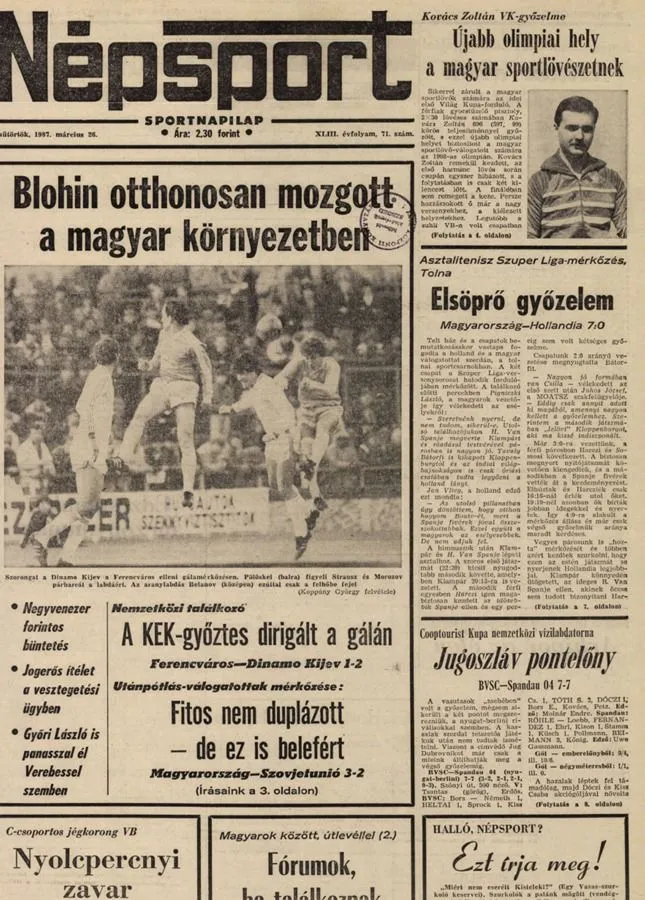 ![]() Abban az évben a Dinamo Kijev lehengerlő játékkal megnyerte a Kupagyőztesek Európa-kupáját, aminek eredményeként Valerij Lobanovszkijt nevezték ki húsz nappal a mexikói labdarúgó-vb rajta előtt szovjet kapitánynak, ő hozta a kijevi fiúkat – a többit meg Irapuatóban láttuk… De alig több mint egy évvel később a Dinamo az Üllői úton barátságos meccset játszott a Ferencvárossal, amely a magyar sajtóban tényleg barátságos, már-már ünnepi volt: „Ügyes megoldások, szép cselek, bátor nagy lövések szórakoztatták a publikumot, csupán a díjmeccseken megszokott tét hiányzott…” Csak éppen az FTC-pálya lelátóján skandálta 22 ezer ember, hogy „Cser-no-bil!” meg hogy „Sugározzatok!” – dolgoztak is a rendfenntartók, gumibottal egyesével emelték ki ötletszerűen az egyre hangosabban tüntető tömegből a mezei szurkolókat, legkevesebb százat… A meccset a Dinamo nyerte meg 2–1-re, a győztes gólt a későbbi ferencvárosi Rácz László lőtte. |