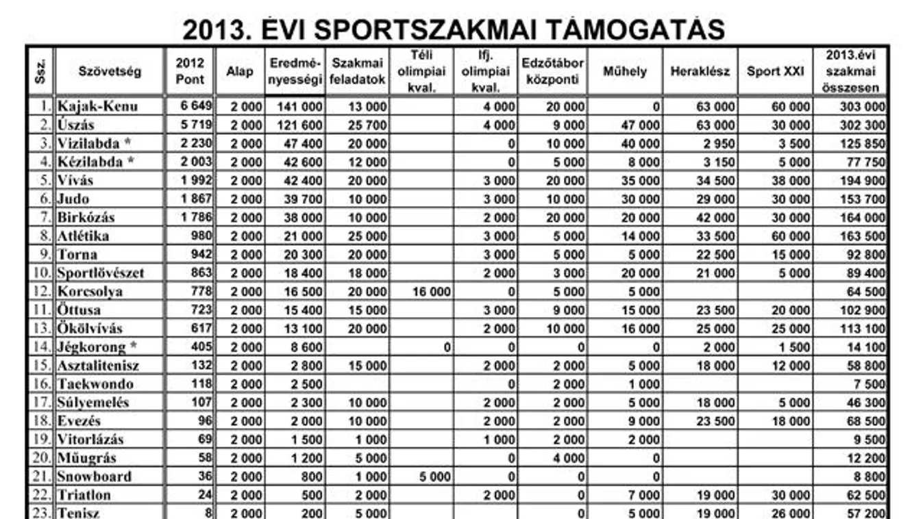 A Magyar Olimpiai Bizottság nyilvánosságra hozta a szakági szövetségek számára megítélt idei sportszakmai támogatások pontos összegét. A legtöbbet – 300 millió forint felett – a kajak-kenu és az úszás kapott. A TAO-kedvezményben már érintett öt látványsportág támogatása nagyságrendekkel kevesebb, a negyvenegy sportágat tartalmazó listán a labdarúgásé például egyedüliként nulla forint. A támogatás összértéke 2 446 650 forint.